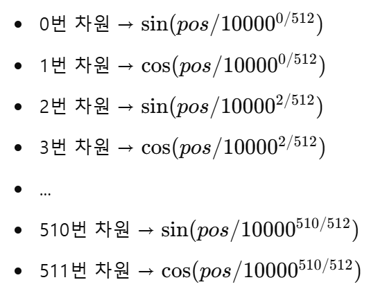 - 짝수 차원 (0, 2, 4, ...) → 사인 함수(sin) 적용