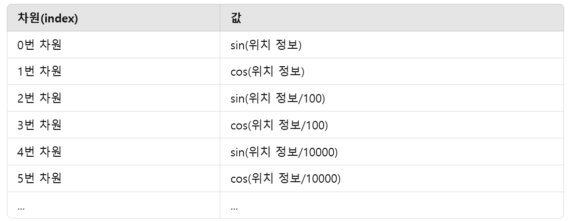 즉, 위치 인코딩 벡터는 아래와 같이 구성된다.