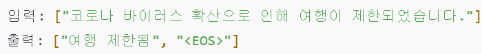 입력: "오늘 날씨가 매우 좋고, 기온이 따뜻합니다." 출력: "오늘 날씨 좋음. <EOS>" → <EOS>가 없으면 모델이 계속 출력을 반복할 수도 있음.